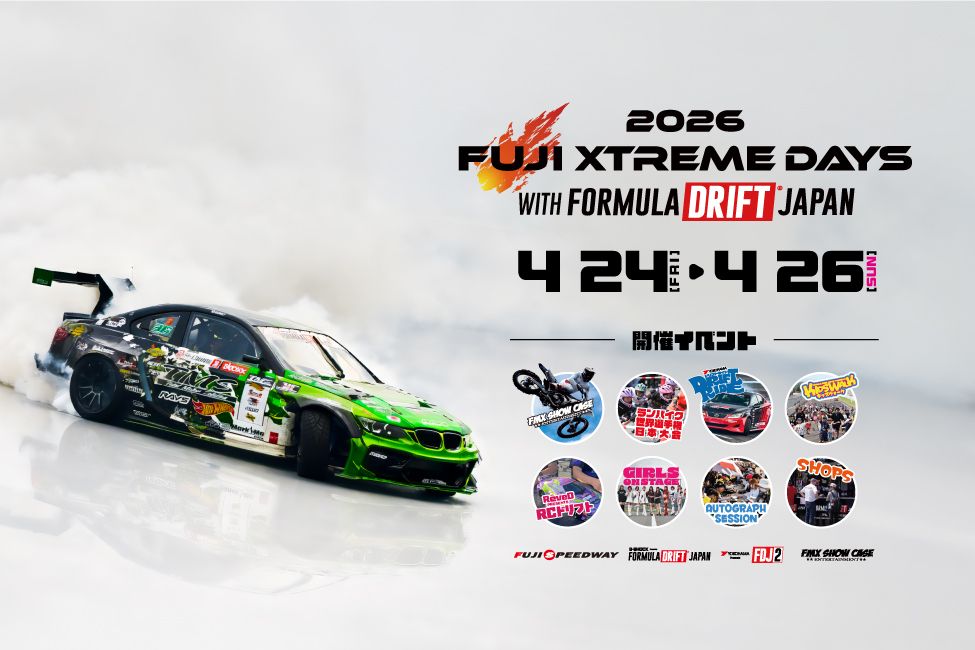 富士スピードウェイで4月24日(金)・25日(土)・26日(日)に開催する、刺激と興奮を味わえるドリフトイベント「2026 FUJI XTREME DAYS with FORMULA DRIFT JAPAN」では、迫力のドリフトグランプリ観戦はもちろん、憧れのレーサーやマシンと触れ合える非日常なサーキット体験が盛りだくさん!