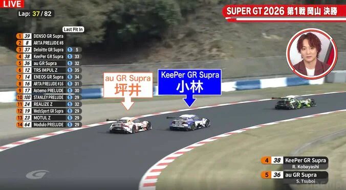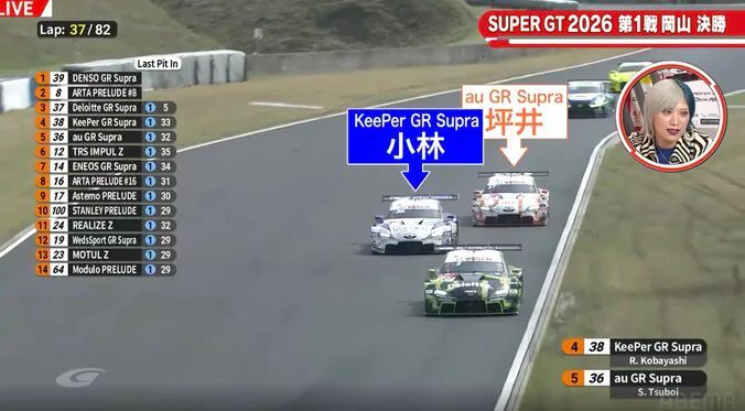 番組内のレースダイジェストでは、決勝のコース上で繰り広げられた激しいポジション争いにもスポットが当てられました。レースは37周目、3位を走るTGR TEAM Deloitte TOM’S(#37 GR Supra)の笹原右京選手を追うTGR TEAM KeePer CERUMO(#38 GR Supra)のルーキー・小林利徠斗選手と、その背後から猛烈なプレップレッシャーをかけるGT500クラス3年連続王者のTGR TEAM au TOM’S(#36 GR Supra)・坪井翔選手による、スープラ同士の熾烈な攻防は大きな見どころとなりました。