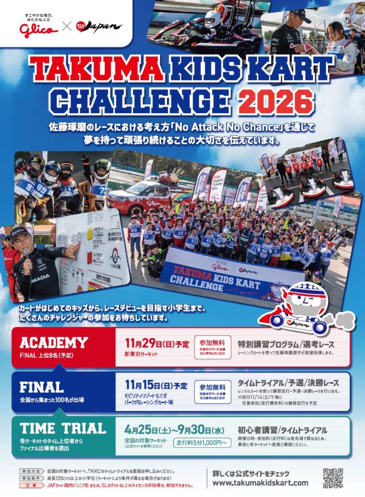 今年も『TAKUMA KIDS KART CHALLENGE』を通じて、多くの子供たちに挑戦の場を提供できることを心から嬉しく思います。また、長年本プロジェクトをサポートしてくださっている江崎グリコ様にも、この場を借りて深く感謝申し上げます。夢に向かって一生懸命に頑張る子供たちの姿は、私自身にとっても初心を思い出させてくれる存在であり、新たに挑戦する力を与えてくれます。私の信念である『No Attack No Chance』の精神が、カートというスポーツを通じて、次世代を担う子供たちの力になることを願っています。今年はスカラシップ生も新たなステージへと羽ばたいており、非常に楽しみなシーズンになりそうです。